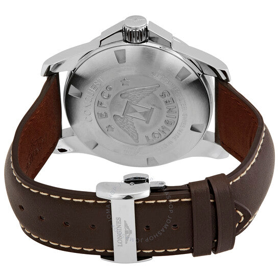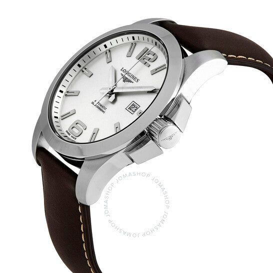 علبة من الفولاذ المقاوم للصدأ مع سوار جلدي بني. إطار ثابت من الفولاذ المقاوم للصدأ. ميناء فضي اللون مع عقارب ومؤشرات ساعات مصقولة باللون الفضي. أرقام عربية عند موضعي الساعة 6 و12. مؤشرات دقائق حول الحافة الخارجية. نوع الميناء: تناظري. عقارب ومؤشرات مضيئة. عرض التاريخ عند موضع الساعة 3. حركة لونجين الأوتوماتيكية عيار L888، مبنية على ETA A31.L11، تحتوي على 21 جوهرة، تنبض بمعدل 25200 ذبذبة في الساعة، ولديها احتياطي طاقة يدوم حوالي 64 ساعة. زجاج من الياقوت المقاوم للخدش. تاج لولبي. غطاء خلفي صلب. شكل دائري. حجم العلبة: 43 مم. سمك العلبة: 12 مم. عرض السوار: 22 مم. مشبك قابل للطي. مقاومة للماء حتى عمق 300 متر / 1000 قدم. الوظائف: التاريخ، الساعة، الدقائق، الثواني. سلسلة كونكويست. تصميم ساعة كاجوال. علامة الساعة: صناعة سويسرية. ساعة لونجين كونكويست أوتوماتيكية للرجال بمينا فضي L3.778.4.76.5.