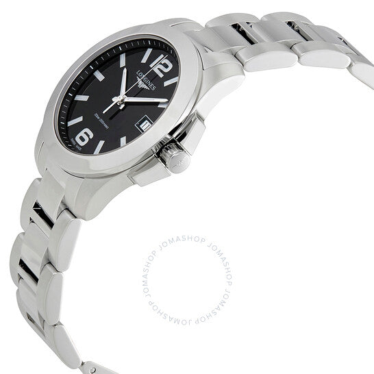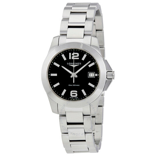 علبة من الفولاذ المقاوم للصدأ مع سوار من الفولاذ المقاوم للصدأ. إطار ثابت من الفولاذ المقاوم للصدأ. ميناء أسود بعقارب فضية مضيئة ومؤشرات ساعات. أرقام عربية تُشير إلى موضعي الساعة 6 و12. مؤشرات دقائق حول الحافة الخارجية. نوع الميناء: تناظري. عرض التاريخ عند موضع الساعة 3. حركة كوارتز من عيار لونجين L156. كريستال ياقوت مقاوم للخدش. تاج لولبي. غطاء خلفي صلب. حجم العلبة: 34 مم. شكل دائري. عرض السوار: 17 مم. مشبك قابل للطي. مقاومة للماء حتى عمق 300 متر / 1000 قدم. الوظائف: التاريخ، الساعة، الدقائق، الثواني. طراز ساعة رسمية. علامة الساعة: صناعة سويسرية. ساعة لونجين كونكويست نسائية بمينا أسود L33774586.