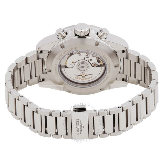 علبة وسوار من الفولاذ المقاوم للصدأ فضي اللون. إطار من السيراميك الأسود بمقياس سرعة دوران ثابت. ميناء بلون الشمبانيا مع عقارب فضية اللون وعلامات ساعات. علامات دقائق حول الحافة الخارجية. نوع الميناء: تناظري. عقارب وعلامات مضيئة. كرونوغراف - ثلاثة موانئ فرعية تعرض: 60 ثانية، 30 دقيقة، و12 ساعة. حركة أوتوماتيكية من لونجين كاليبر L898. زجاج من الياقوت المقاوم للخدش. تاج لولبي. غطاء خلفي شفاف. شكل دائري، مقاس العلبة: 42 مم، سمكها: 14.3 مم. عرض السوار: 22 مم. مشبك قابل للطي مع مفتاح أمان. مقاومة للماء حتى عمق 100 متر / 330 قدم. الوظائف: كرونوغراف، ساعات، دقائق، ثوانٍ. سلسلة كونكويست. تصميم ساعة فاخرة. علامة الساعة: صناعة سويسرية. ساعة لونجين كونكويست كرونوغراف أوتوماتيكية للرجال بمينا بلون الشمبانيا، L3.835.4.32.6.