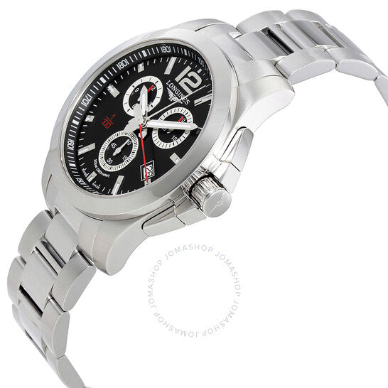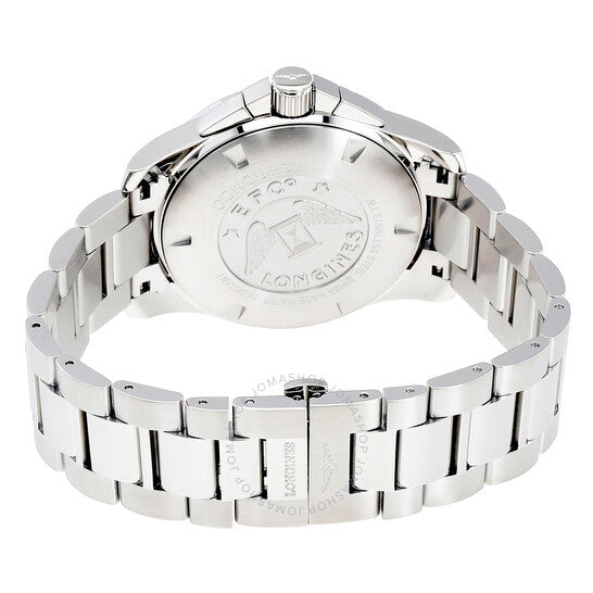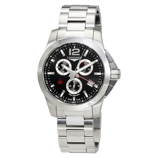 علبة من الفولاذ المقاوم للصدأ مع سوار من الفولاذ المقاوم للصدأ. إطار ثابت من الفولاذ المقاوم للصدأ. ميناء أسود مع عقارب فضية مضيئة وعلامات ساعات. يظهر رقم عربي عند موضع الساعة ١٢. علامات الدقائق. علامات ١/١٠٠ ثانية حول الحافة الخارجية. نوع الميناء: تناظري. عقارب وعلامات مضيئة. عرض التاريخ عند موضع الساعة ٤. كرونوغراف - ثلاثة أقراص فرعية تعرض: ٦٠ ثانية، ٣٠ دقيقة، و١٢ ساعة. حركة كوارتز لونجين عيار ٤٤٠. كريستال ياقوت مقاوم للخدش. تاج لولبي. غطاء خلفي صلب. حجم العلبة: ٤٤ مم. سمك العلبة: ١١.٥ مم. شكل دائري. عرض السوار: ٢٢ مم. مشبك قابل للطي. مقاومة للماء حتى عمق ٣٠٠ متر / ١٠٠٠ قدم. الوظائف: كرونوغراف، تاريخ، ساعة، دقيقة، ثانية. تصميم ساعة فاخرة. ملصق الساعة: صناعة سويسرية. ساعة لونجين كونكويست كرونوغراف للرجال بمينا أسود من الفولاذ المقاوم للصدأ L38004566.