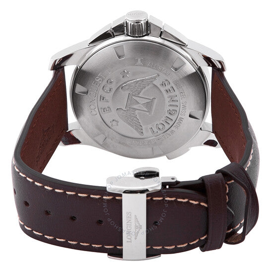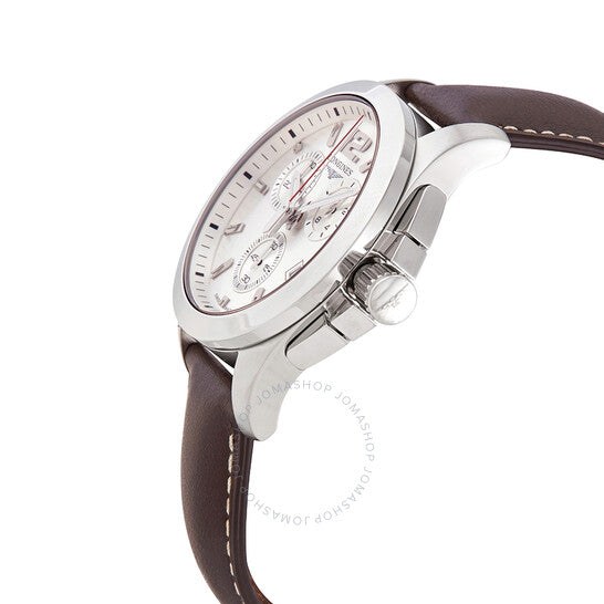 علبة من الفولاذ المقاوم للصدأ مع سوار جلدي بني. إطار ثابت من الفولاذ المقاوم للصدأ. ميناء فضي مع عقارب مضيئة ومؤشرات ساعات فضية اللون. يظهر رقم عربي عند موضع الساعة ١٢. علامات دقائق حول الحافة الخارجية. نوع الميناء: تناظري. عقارب ومؤشرات مضيئة. عرض التاريخ عند موضع الساعة ٤. كرونوغراف - ثلاثة موانئ فرعية تعرض: ٦٠ ثانية، ٣٠ دقيقة، و١/١٠ ثانية. حركة كوارتز من لونجين، عيار L442. كريستال ياقوت مقاوم للخدش. تاج لولبي. غطاء خلفي صلب. شكل دائري. حجم العلبة: ٤١ مم. سمكها: ١٥.١٥ مم. عرض السوار: ٢١ مم. مشبك قابل للطي. مقاومة للماء حتى عمق ٣٠٠ متر / ١٠٠٠ قدم. الوظائف: كرونوغراف، تاريخ، ساعة، دقيقة، ثانية. سلسلة كونكويست. طراز ساعة غوص. ملصق الساعة: صناعة سويسرية. ساعة لونجين كونكويست كرونوغراف كوارتز بمينا فضي للرجال L3.702.4.76.5.