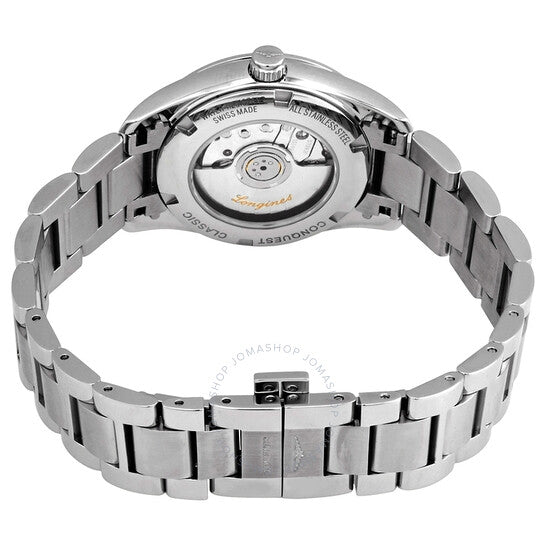 علبة من الفولاذ المقاوم للصدأ مع سوار من الفولاذ المقاوم للصدأ. إطار ثابت من الفولاذ المقاوم للصدأ. ميناء أسود بعقارب فضية مضيئة وعلامات ساعات من الألماس. علامات دقائق حول الحافة الخارجية. نوع الميناء: تناظري. عقارب مضيئة. عرض التاريخ عند موضع الساعة 3. حركة أوتوماتيكية من لونجين، عيار L595، مع احتياطي طاقة لمدة 40 ساعة. زجاج ياقوت مقاوم للخدش. تاج لولبي. غطاء خلفي شفاف. شكل دائري. حجم العلبة: 29.5 مم. عرض السوار: 15 مم. مشبك ثلاثي الطي. مقاومة للماء حتى عمق 50 مترًا / 165 قدمًا. الوظائف: التاريخ، الساعة، الدقيقة، الثانية. تصميم ساعة فاخرة. علامة الساعة: صناعة سويسرية. ساعة لونجين كونكويست كلاسيك أوتوماتيكية نسائية بمينا أسود، L2.285.4.58.6.