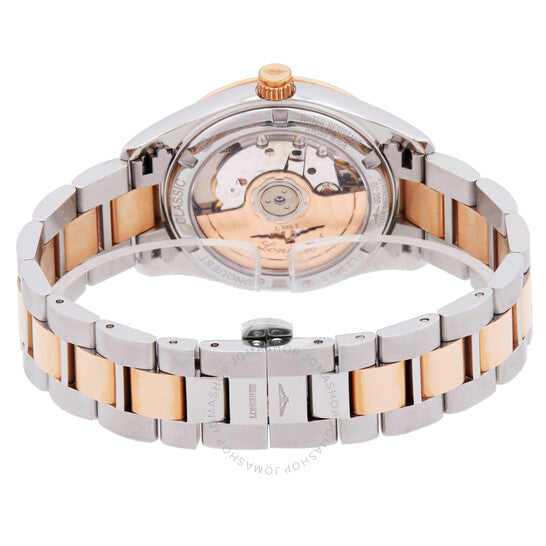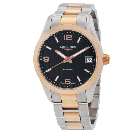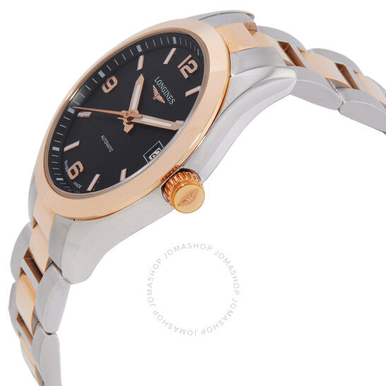 علبة من الفولاذ المقاوم للصدأ فضية اللون، مع سوار من الفولاذ المقاوم للصدأ ثنائي اللون (فضي وذهبي وردي) وذهب وردي عيار 18 قيراطًا. إطار ثابت من الذهب الوردي عيار 18 قيراطًا. ميناء أسود مع عقارب وعلامات ساعات ذهبية وردية اللون. علامات دقائق حول الحافة الخارجية. نوع الميناء: تناظري. عرض التاريخ عند موضع الساعة 3. حركة لونجين كاليبر L619/888 أوتوماتيكية، مبنية على ETA 2892، تحتوي على 21 جوهرة، تنبض بمعدل 25200 ذبذبة في الساعة، ولديها احتياطي طاقة لمدة 64 ساعة تقريبًا. زجاج ياقوتي مقاوم للخدش. هيكل دائري الشكل، مقاس الهيكل: 34 مم، سمك الهيكل: 11.5 مم. عرض السوار: 17 مم. مشبك قابل للطي. مقاومة للماء حتى عمق 50 مترًا / 165 قدمًا. الوظائف: التاريخ، الساعة، الدقائق، الثواني. معلومات إضافية: العلبة الأصلية، بطاقة الضمان الدولية، دليل الاستخدام (الملحقات الكاملة). سلسلة كونكويست كلاسيك. ساعة فاخرة. علامة الساعة: صناعة سويسرية. ساعة لونجين كونكويست كلاسيك أوتوماتيكية نسائية بمينا أسود، L2.385.5.56.7.