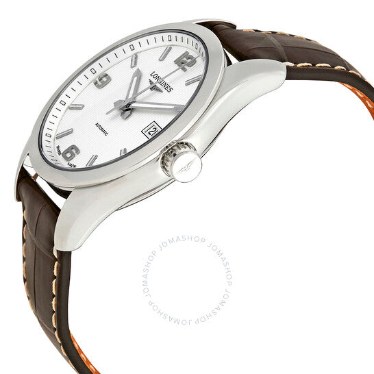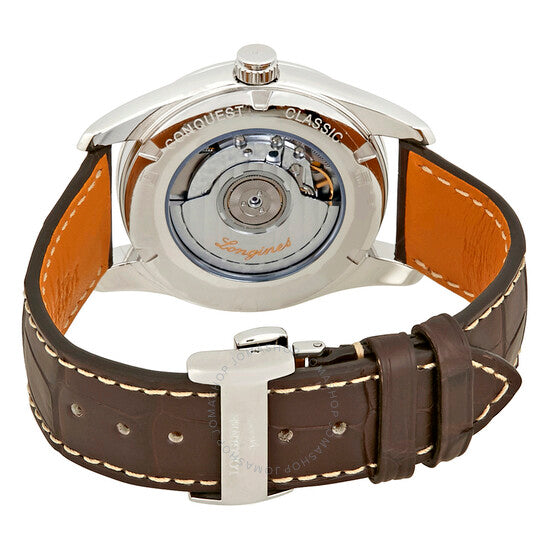 علبة من الفولاذ المقاوم للصدأ مع سوار بني من جلد التمساح. إطار ثابت من الفولاذ المقاوم للصدأ. ميناء فضي بعقارب مضيئة ومؤشرات ساعات. أرقام عربية تُشير إلى الساعات 3 و6 و9 و12. مؤشرات دقائق حول الحافة الخارجية. نوع الميناء: تناظري. عقارب ومؤشرات مضيئة. عرض التاريخ عند الساعة 3. حركة أوتوماتيكية من لونجين، عيار L619، مع احتياطي طاقة لمدة 42 ساعة. زجاج ياقوت مقاوم للخدش. تاج قابل للسحب/الدفع. غطاء خلفي شفاف. حجم العلبة: 40 مم. شكلها دائري. مشبك تانغ. مقاومة للماء حتى عمق 50 مترًا / 165 قدمًا. الوظائف: التاريخ، الساعة، الدقيقة، الثانية. تصميم كاجوال. علامة الساعة: صناعة سويسرية. رقم الموديل: L27854763. ساعة لونجين كونكويست كلاسيك أوتوماتيكية للرجال، L2.785.4.76.3.