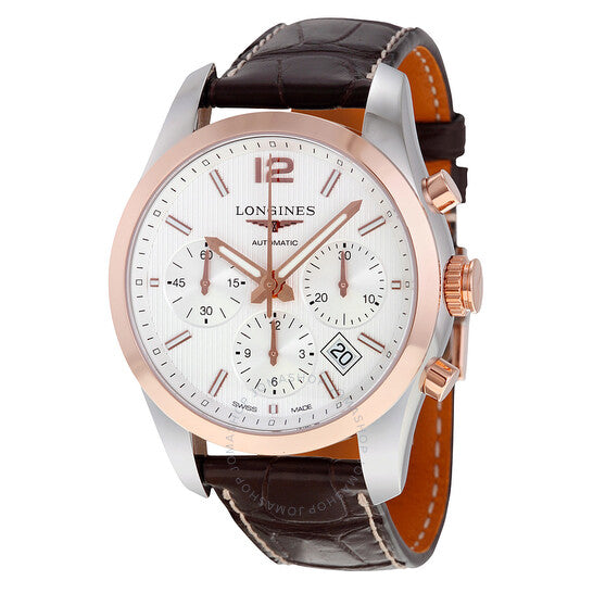 علبة من الفولاذ المقاوم للصدأ مع سوار من جلد التمساح البني. إطار ثابت مطلي بالذهب الوردي بتقنية الترسيب الفيزيائي للبخار (PVD). ميناء أبيض مع عقارب مضيئة ومؤشرات ساعات ذهبية وردية. يظهر رقم عربي عند موضع الساعة ١٢. علامات دقائق حول الحافة الخارجية. نوع الميناء: تناظري. عقارب ومؤشرات مضيئة. عرض التاريخ بين موضعي الساعة ٤ و٥. كرونوغراف - ثلاثة موانئ فرعية تعرض: ٦٠ ثانية، ٣٠ دقيقة، و١٢ ساعة. حركة أوتوماتيكية مع احتياطي طاقة ٥٤ ساعة. زجاج ياقوت مقاوم للخدش. تاج قابل للسحب/الدفع. غطاء خلفي شفاف. حجم العلبة: ٤١ مم. سمكها: ١٤ مم. شكلها دائري. مشبك قابل للطي. مقاومة للماء حتى عمق ٥٠ مترًا / ١٦٥ قدمًا. الوظائف: كرونوغراف، تاريخ، ساعة، دقيقة، ثانية. طراز ساعة فاخرة. علامة الساعة: صناعة سويسرية. رقم الصنف: L27865763. ساعة لونجين كونكويست كلاسيك كرونوغراف أوتوماتيكية للرجال L27865763.