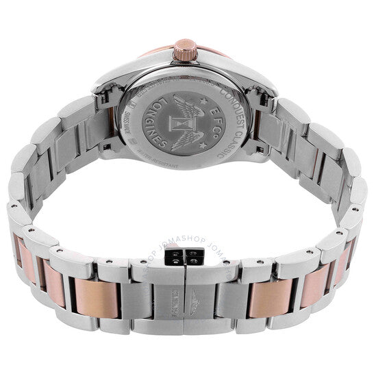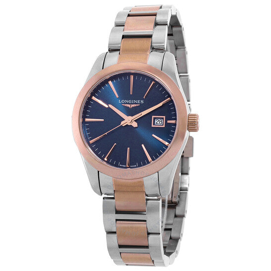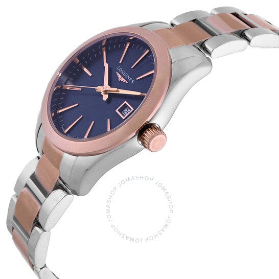 علبة من الفولاذ المقاوم للصدأ مطلية بالذهب الوردي، مع سوار من الفولاذ المقاوم للصدأ المصقول والمصقول. إطار ثابت. ميناء أزرق مع عقارب ومؤشرات ساعات باللون الذهبي الوردي. نوع الميناء: تناظري. عرض التاريخ عند موضع الساعة 3. آلية حركة كوارتز. زجاج ياقوتي مقاوم للخدش. تاج قابل للسحب/الدفع. غطاء خلفي صلب. شكل دائري، مقاس العلبة: 29.5 مم. مشبك قابل للطي بزر ضغط. مقاومة للماء حتى عمق 50 مترًا. الوظائف: التاريخ، الساعة، الدقائق، الثانية. سلسلة كونكويست كلاسيك. طراز ساعة رسمية. علامة الساعة: صناعة سويسرية. ساعة لونجين كونكويست كلاسيك كوارتز نسائية بمينا زرقاء، L2.286.3.92.7.