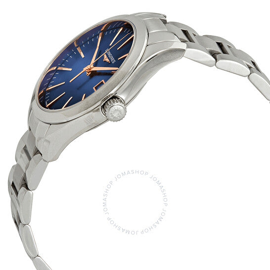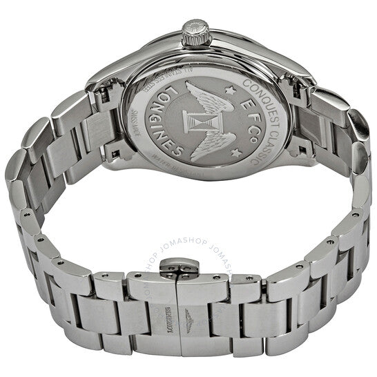 علبة وسوار من الفولاذ المقاوم للصدأ فضي اللون. إطار ثابت من الفولاذ المقاوم للصدأ فضي اللون. ميناء أزرق مع عقارب وعلامات ساعات ذهبية وردية اللون. علامات دقائق حول الحافة الخارجية. نوع الميناء: تناظري. عرض التاريخ عند موضع الساعة 3. حركة كوارتز عيار 156. زجاج ياقوتي مقاوم للخدش. تاج قابل للسحب/الدفع. غطاء خلفي صلب. شكل دائري، مقاس العلبة: 34 مم، سمكها: 8.9 مم. عرض السوار: 17 مم. مشبك قابل للطي بزر ضغط. مقاومة للماء حتى عمق 50 مترًا / 165 قدمًا. الوظائف: التاريخ، الساعة، الدقائق، الثواني. سلسلة كونكويست كلاسيك. طراز ساعة رسمية. علامة الساعة: صناعة سويسرية. ساعة لونجين كونكويست كلاسيك كوارتز نسائية بمينا زرقاء، طراز L23864926.