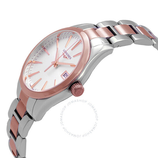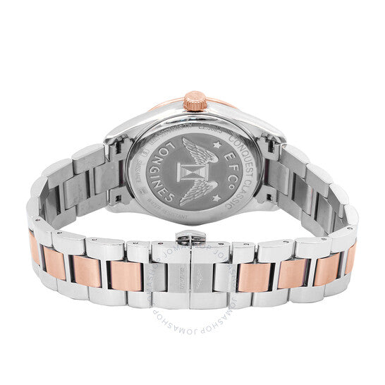 علبة من الفولاذ المقاوم للصدأ مع سوار من الفولاذ المقاوم للصدأ ثنائي اللون (فضي وذهبي أحمر مطلي بتقنية PVD). إطار ثابت من الذهب الأحمر مطلي بتقنية PVD. ميناء فضي لامع بعقارب ومؤشرات ساعات ذهبية حمراء. مؤشرات دقائق حول الحافة الخارجية. نوع الميناء: تناظري. عرض التاريخ عند موضع الساعة 3. حركة كوارتز من عيار لونجين L156. زجاج ياقوتي مقاوم للخدش. تاج قابل للسحب/الدفع. غطاء خلفي صلب. شكل دائري. حجم العلبة: 34 مم. سمكها: 8.9 مم. عرض السوار: 17 مم. مشبك ثلاثي الطي. مقاومة للماء حتى عمق 50 مترًا / 165 قدمًا. الوظائف: التاريخ، الساعة، الدقيقة، الثانية. سلسلة كونكويست كلاسيك. طراز ساعة رسمية. علامة الساعة: صناعة سويسرية. ساعة لونجين كونكويست كلاسيك كوارتز نسائية L2.386.3.72.7.