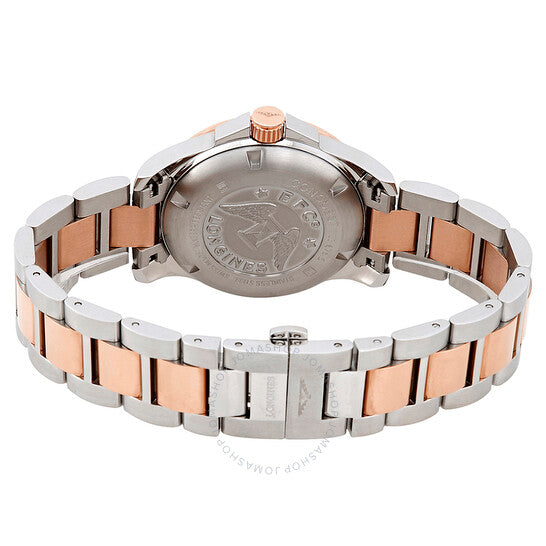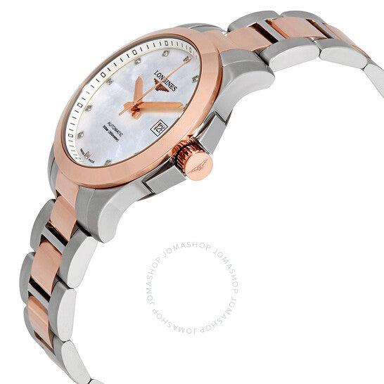علبة من الفولاذ المقاوم للصدأ والذهب الوردي عيار 18 قيراطًا، مع سوار من الفولاذ المقاوم للصدأ والذهب الوردي عيار 18 قيراطًا. إطار ثابت من الذهب الوردي عيار 18 قيراطًا. ميناء من عرق اللؤلؤ مع عقارب بلون الذهب الوردي وعلامات ساعات من الألماس. علامات دقائق حول الحافة الخارجية. نوع الميناء: تناظري. عرض التاريخ عند موضع الساعة 3. حركة أوتوماتيكية. زجاج ياقوت مقاوم للخدش. تاج لولبي. حجم العلبة: 39 مم. شكل دائري. مشبك قابل للطي. مقاومة للماء حتى عمق 300 متر / 1000 قدم. الوظائف: التاريخ، الساعة، الدقيقة، الثانية. طراز ساعة فاخرة. علامة الساعة: صناعة سويسرية. إصدارات المنتج: L3 676 5 87 7، L3-676-5-87-7، L3/676/5/87/7، L36765877. ساعة لونجين كونكويست الرجالية المرصعة بالألماس واللؤلؤ L3.676.5.87.7.