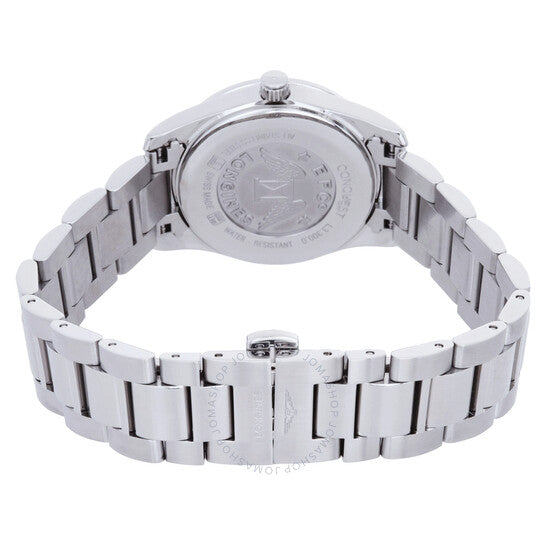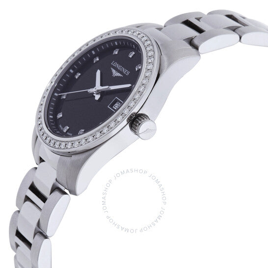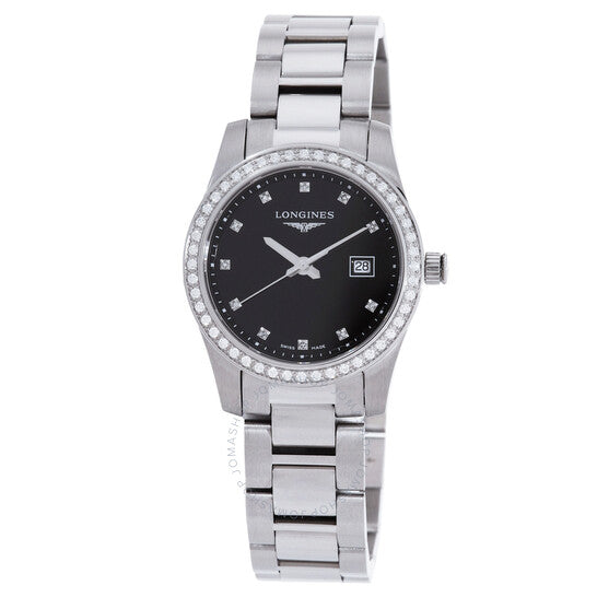 علبة وسوار من الفولاذ المقاوم للصدأ فضي اللون. إطار ثابت فضي اللون مرصع بالألماس من الفولاذ المقاوم للصدأ. ميناء أسود بعقارب فضية اللون وعلامات ساعات من الألماس. علامات دقائق حول الحافة الخارجية. نوع الميناء: تناظري. عرض التاريخ عند موضع الساعة 3. حركة كوارتز. زجاج ياقوتي مقاوم للخدش. علبة دائرية الشكل، مقاسها: 29 مم. مشبك قابل للطي. الوظائف: التاريخ، الساعة، الدقائق، الثواني. معلومات إضافية: العلبة الأصلية، بطاقة الضمان الدولية، دليل الاستخدام (ملحقات كاملة). سلسلة كونكويست. طراز ساعة فاخرة. علامة الساعة: صناعة سويسرية. ساعة لونجين كونكويست كوارتز نسائية مرصعة بالألماس بمينا أسود، L3.300.0.57.6.