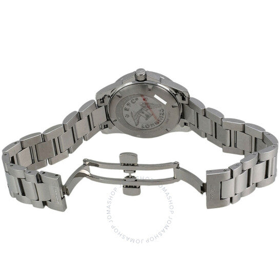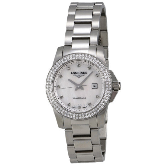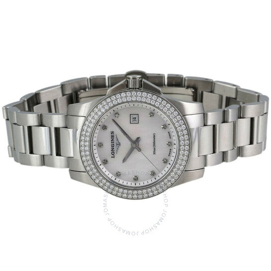 علبة وسوار من الفولاذ المقاوم للصدأ فضي اللون. إطار ثابت فضي اللون مرصع بالألماس من الفولاذ المقاوم للصدأ. ميناء من عرق اللؤلؤ مع عقارب فضية اللون وعلامات ساعات من الألماس. علامات دقائق حول الحافة الخارجية. نوع الميناء: تناظري. عرض التاريخ عند موضع الساعة 3. حركة كوارتز لونجين كاليبر L250. زجاج ياقوت مقاوم للخدش. تاج لولبي. غطاء خلفي صلب. شكل العلبة دائري، مقاسها: 30 مم، سمكها: 9 مم. عرض السوار: 15 مم. قابلة للطي بمشبك مزدوج يعمل بزر ضغط. مقاومة للماء حتى عمق 300 متر / 1000 قدم. الوظائف: التاريخ، الساعة، الدقائق، الثواني، مؤشر عمر البطارية. سلسلة كونكويست. تصميم ساعة فاخرة. علامة الساعة: صناعة سويسرية. إصدارات المنتج: L3 258 0 87 6، L3-258-0-87-6، L3/258/0/87/6، L32580876. ساعة لونجين كونكويست كوارتز دايموند للسيدات L3.258.0.87.6.