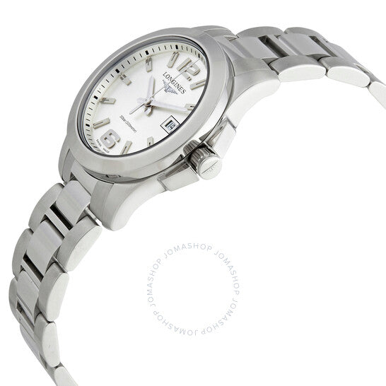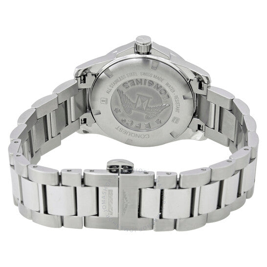 علبة من الفولاذ المقاوم للصدأ مع سوار من الفولاذ المقاوم للصدأ. إطار ثابت من الفولاذ المقاوم للصدأ. ميناء فضي اللون مع عقارب ومؤشرات ساعات فضية اللون. أرقام عربية تُشير إلى موضعي الساعة 6 و12. مؤشرات دقائق حول الحافة الخارجية. نوع الميناء: تناظري. عرض التاريخ عند موضع الساعة 3. حركة كوارتز من عيار لونجين L152. زجاج ياقوت مقاوم للخدش. تاج لولبي. غطاء خلفي صلب. حجم العلبة: 29.5 مم. سُمكها: 15 مم. شكلها دائري. مشبك قابل للطي. مقاومة للماء حتى عمق 300 متر / 1000 قدم. الوظائف: التاريخ، الساعة، الدقائق، الثواني، ميزة انتهاء الصلاحية. طراز ساعة الغوص. علامة الساعة: صناعة سويسرية. ساعة لونجين كونكويست نسائية بمينا فضي L33764766