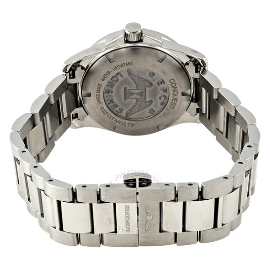 علبة من الفولاذ المقاوم للصدأ مع سوار من الفولاذ المقاوم للصدأ. إطار ثابت من الفولاذ المقاوم للصدأ. ميناء أزرق بنقشة أشعة الشمس مع عقارب ومؤشرات ساعات فضية مضيئة. أرقام عربية تُشير إلى موضعي الساعة 6 و12. مؤشرات دقائق حول الحافة الخارجية. نوع الميناء: تناظري. عقارب ومؤشرات مضيئة. عرض التاريخ عند موضع الساعة 3. حركة كوارتز من عيار لونجين L152. زجاج ياقوت مقاوم للخدش. تاج لولبي. غطاء خلفي صلب. شكل دائري. حجم العلبة: 29.50 مم. سُمكها: 9 مم. مشبك قابل للطي. مقاومة للماء حتى عمق 300 متر / 1000 قدم. الوظائف: التاريخ، الساعة، الدقائق، الثواني. تصميم كاجوال. علامة الساعة: صناعة سويسرية. ساعة لونجين كونكويست صن راي النسائية بمينا أزرق L3.376.4.96.6.