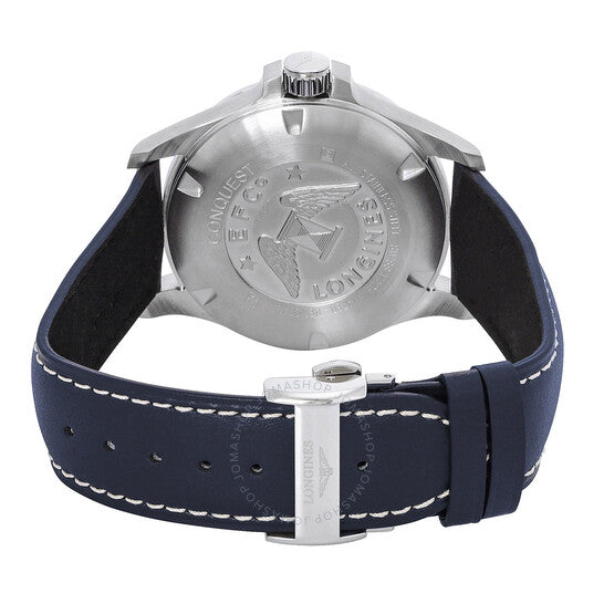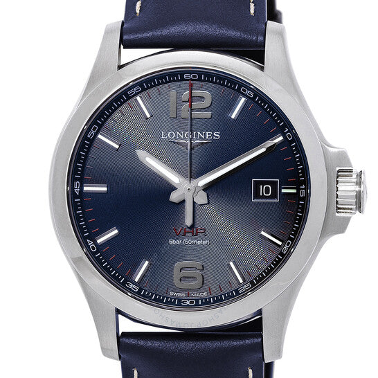 علبة فضية اللون من الفولاذ المقاوم للصدأ مع سوار جلدي أزرق. إطار ثابت فضي اللون من الفولاذ المقاوم للصدأ. ميناء أزرق مع عقارب فضية مضيئة ومؤشرات ساعات رقمية عربية. تظهر الأرقام العربية عند موضعي الساعة 6 و12. مؤشرات دقائق رقمية عربية (بفاصل 5 دقائق). نوع الميناء: تناظري. عقارب ومؤشرات مضيئة. عرض التاريخ عند موضع الساعة 3. حركة كوارتز لونجين كاليبر L288. زجاج ياقوت مقاوم للخدش. تاج قابل للسحب/الدفع. غطاء خلفي صلب. شكل دائري، مقاس العلبة: 43 مم. عرض السوار: 22 مم. مشبك قابل للطي. مقاومة للماء حتى عمق 50 مترًا / 165 قدمًا. الوظائف: التاريخ، الساعة، الدقيقة، الثانية، مؤشر عمر البطارية، مقاومة للصدمات، مقاومة للمغناطيس. سلسلة Conquest VHP. تصميم ساعة كاجوال. علامة الساعة: صناعة سويسرية. ساعة لونجين Conquest VHP كوارتز زرقاء للرجال، L3.726.4.96.7.