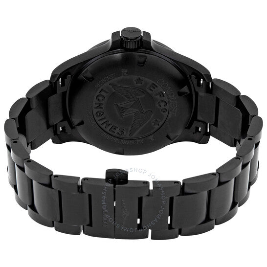 علبة وسوار من الفولاذ المقاوم للصدأ مطليان باللون الأسود بتقنية PVD. إطار ثابت من الفولاذ المقاوم للصدأ مطلي باللون الأسود بتقنية PVD. ميناء فضي بعقارب سوداء وأرقام عربية لعلامات الساعات. علامات دقائق حول الحافة الخارجية. نوع الميناء: تناظري. عقارب وعلامات مضيئة. عرض التاريخ عند موضع الساعة 3. حركة كوارتز من لونجين كاليبر L288. زجاج ياقوت مقاوم للخدش. تاج قابل للسحب/الدفع. غطاء خلفي صلب. شكل دائري، مقاس العلبة: 41 مم. عرض السوار: 20 مم. مشبك فراشة. مقاومة للماء حتى عمق 50 مترًا / 165 قدمًا. الوظائف: التاريخ، الساعة، الدقيقة، الثانية. سلسلة Conquest VHP. تصميم كاجوال. علامة الساعة: صناعة سويسرية. ساعة لونجين Conquest VHP كوارتز للرجال بمينا فضي، L3.716.2.76.6.