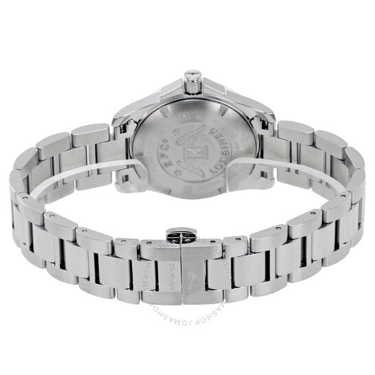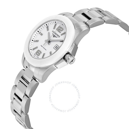 علبة من الفولاذ المقاوم للصدأ مع سوار من الفولاذ المقاوم للصدأ. إطار ثابت من السيراميك الأبيض. ميناء أبيض بعقارب ومؤشرات ساعات فضية اللون. أرقام عربية تُشير إلى موضعي الساعة 6 و12. مؤشرات دقائق حول الحافة الخارجية. نوع الميناء: تناظري. عقارب ومؤشرات مضيئة. عرض التاريخ عند موضع الساعة 3. حركة كوارتز. محرك عيار l250. كريستال ياقوت مقاوم للخدش. تاج لولبي. غطاء خلفي صلب. قطر العلبة: 29.5 مم. سُمكها: 9 مم. شكلها دائري. مشبك قابل للطي. مقاومة للماء حتى عمق 300 متر / 1000 قدم. الوظائف: التاريخ، الساعة، الدقيقة، الثانية. طراز ساعة فاخرة. علامة الساعة: صناعة سويسرية. إصدارات الساعة: L3 257 4 16 6، L3-257-4-16-6، L3/257/4/16/6، L32574166. ساعة لونجين كونكويست للسيدات بمينا أبيض وفولاذ مقاوم للصدأ L3.257.4.16.6.