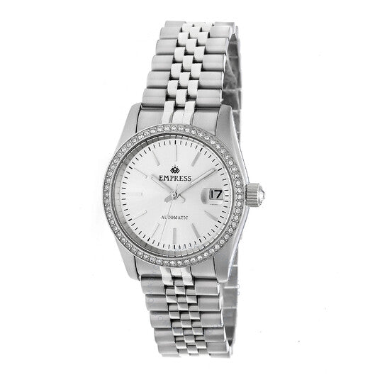 علبة من الفولاذ المقاوم للصدأ فضية اللون مع سوار فضي اللون. إطار ثابت مرصع بكريستال فضي اللون. ميناء فضي اللون مع عقارب وعلامات ساعات فضية اللون. علامات دقائق حول الحافة الخارجية. نوع الميناء: تناظري. عقارب مضيئة. عرض التاريخ عند موضع الساعة 3. حركة أوتوماتيكية. كريستال معدني مقاوم للخدش. غطاء خلفي شفاف. شكل العلبة دائري، مقاسها: 37 مم، سمكها: 13 مم. عرض السوار: 20 مم. مشبك قابل للطي بزر ضغط. مقاومة للماء حتى عمق 50 مترًا / 165 قدمًا. الوظائف: التاريخ، الساعة، الدقائق، الثواني. طراز ساعة رسمية. إصدارات متنوعة: EMPEM1501. ساعة إمبريس كونستانس أوتوماتيكية نسائية بمينا فضي كريستالي EMPEM1501.