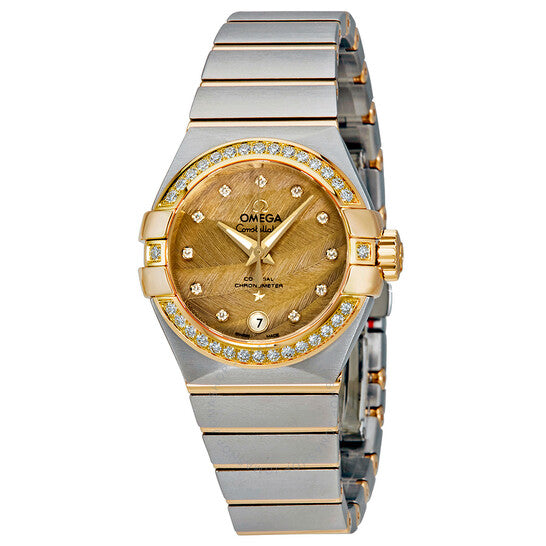 علبة من الفولاذ المقاوم للصدأ فضية اللون، مع سوار من الفولاذ المقاوم للصدأ ثنائي اللون (فضي وذهبي أصفر) وذهب أصفر عيار 18 قيراطًا. إطار ثابت من الذهب الأصفر عيار 18 قيراطًا مرصع بالألماس. ميناء مطلي بلون الشمبانيا الرملي، مع عقارب ذهبية على شكل دوفين وعلامات ساعات مرصعة بالألماس. نوع الميناء: تناظري. عقارب مضيئة. عرض التاريخ عند موضع الساعة السادسة. حركة أوميجا كاليبر 8520 أوتوماتيكية، مستوحاة من أوميجا 8500، تحتوي على 28 جوهرة، تنبض بمعدل 25200 ذبذبة في الساعة، ولديها احتياطي طاقة يصل إلى حوالي 50 ساعة. زجاج من الياقوت المقاوم للخدش. تاج لولبي. غطاء خلفي شفاف. شكل دائري. حجم العلبة: 27 مم. مشبك قابل للطي بزر ضغط. مقاومة للماء حتى عمق 100 متر / 330 قدمًا. الوظائف: التاريخ، الساعة، الدقيقة، الثانية، الكرونومتر. طراز ساعة فاخرة. ملصق الساعة: صناعة سويسرية. ساعة أوميغا كونستليشن أوتوماتيكية للسيدات 123.25.27.20.58.002.