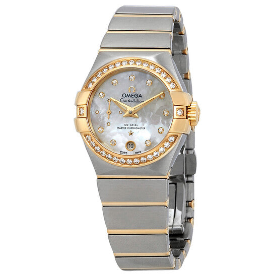 علبة من الفولاذ المقاوم للصدأ فضية اللون، وسوار من الفولاذ المقاوم للصدأ فضي اللون، وقضبان من الذهب الأصفر عيار 18 قيراطًا. إطار ثابت من الذهب الأصفر عيار 18 قيراطًا مرصع بالألماس. ميناء من عرق اللؤلؤ الأبيض، وعقارب ذهبية اللون، وعلامات ساعات من الألماس. نوع الميناء: تناظري. عقارب مضيئة. نافذة لعرض التاريخ عند موضع الساعة السادسة. ميناء فرعي واحد يعرض الثواني الصغيرة. حركة أوتوماتيكية من أوميغا كاليبر 8704، تحتوي على 28 جوهرة، وتنبض بتردد 25200 ذبذبة في الساعة، وتحتفظ باحتياطي طاقة يصل إلى 50 ساعة تقريبًا. زجاج ياقوت مقاوم للخدش. غطاء خلفي شفاف. شكل دائري، مقاس العلبة: 27 مم. عرض السوار: 17 مم، طول السوار: 6 بوصات. مشبك قابل للطي. مقاومة للماء حتى عمق 100 متر / 330 قدمًا. الوظائف: التاريخ، الساعات، الدقائق، الثواني، ميزان محوري، كرونومتر. سلسلة كونستليشن. تصميم ساعة فاخرة. علامة الساعة: صناعة سويسرية. ساعة أوميغا كونستليشن أوتوماتيكية للسيدات 127.25.27.20.55.002.