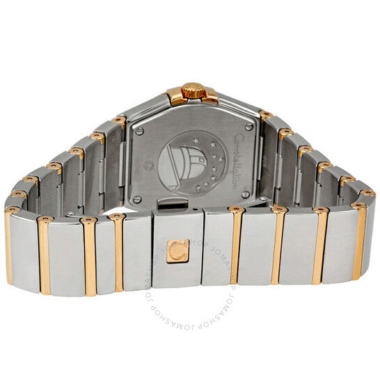 علبة من الفولاذ المقاوم للصدأ مع سوار من الفولاذ المقاوم للصدأ بقضبان من الذهب الوردي عيار 18 قيراطًا. إطار ثابت من الذهب الوردي عيار 18 قيراطًا مرصع بالألماس. ميناء من عرق اللؤلؤ مع عقارب ذهبية اللون وعلامات ساعات مرصعة بـ 12 ماسة. حركة كوارتز. كريستال ياقوت مقاوم للخدش. تاج قابل للضغط والسحب. غطاء خلفي صلب. قطر العلبة: 27 مم. سُمكها: 9 مم. مشبك قابل للطي بزر ضغط. مقاومة للماء حتى عمق 30 مترًا/100 قدم. الوظائف: الساعات، الدقائق. ساعة أوميغا كونستليشن نسائية بمينا ألماس 123.25.27.60.55.005.