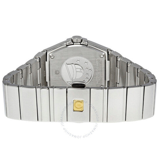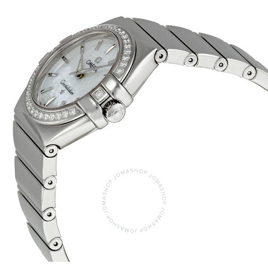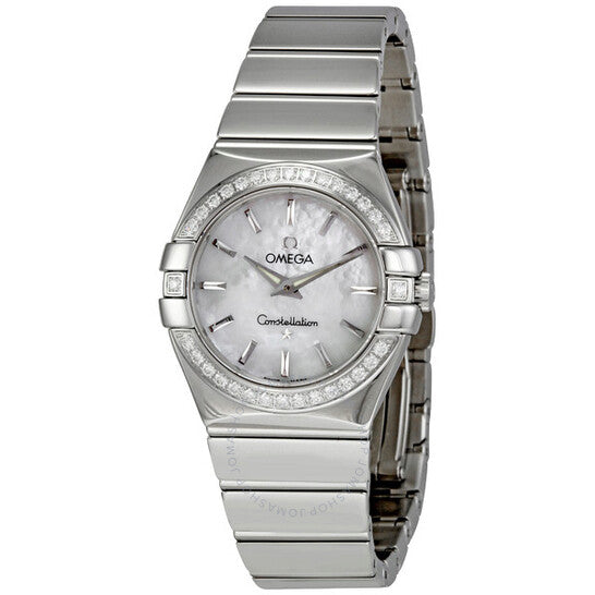 علبة من الفولاذ المقاوم للصدأ مع سوار من الفولاذ المقاوم للصدأ. إطار ثابت من الفولاذ المقاوم للصدأ مرصع بـ 28 ماسة. ميناء من عرق اللؤلؤ مع عقارب فضية اللون وعلامات ساعات. يظهر اسم أوميغا أسفل موضع الساعة 12. آلية حركة كوارتز. زجاج من الياقوت المقاوم للخدش. تاج من الفولاذ المزخرف. غطاء خلفي صلب. قطر العلبة: 27 مم. سُمكها: 9 مم. مشبك قابل للطي بزر ضغط. مقاومة للماء حتى عمق 100 متر / 330 قدمًا. ساعة أوميغا كونستليشن دايموند نسائية 12315276005002