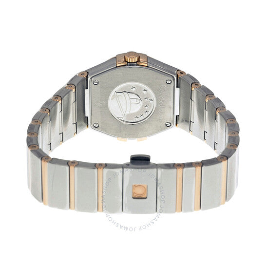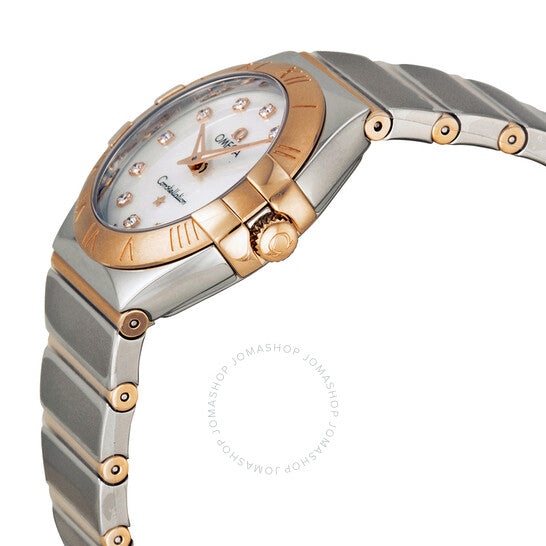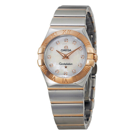 علبة وسوار من الفولاذ المقاوم للصدأ مع قضبان من الذهب الوردي عيار 18 قيراطًا. إطار ثابت من الذهب الوردي عيار 18 قيراطًا. ميناء من عرق اللؤلؤ مع عقارب بلون الذهب الوردي وعلامات ساعات من الألماس. نوع الميناء: تناظري. عقارب مضيئة. آلية حركة كوارتز. زجاج ياقوت مقاوم للخدش. تاج قابل للسحب/الدفع. غطاء خلفي صلب. قطر العلبة: 27 مم. سمكها: 9 مم. شكلها دائري. عرض السوار: 18 مم. مشبك قابل للطي بزر ضغط. مقاومة للماء حتى عمق 100 متر / 330 قدمًا. الوظائف: الساعات، الدقائق. تصميم ساعة فاخرة. علامة الساعة: صناعة سويسرية. ساعة أوميغا كونستليشن دايموند نسائية، ميناء من عرق اللؤلؤ، فولاذ وذهب وردي، 12320276055003.