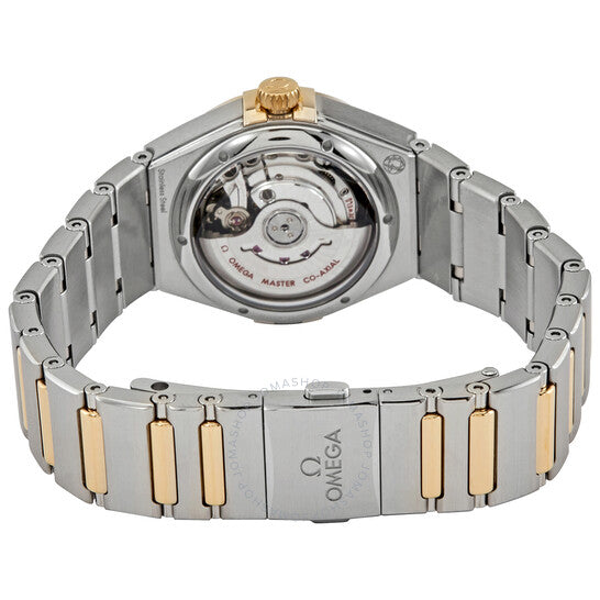 علبة من الفولاذ المقاوم للصدأ فضية اللون، مع سوار من الفولاذ المقاوم للصدأ ثنائي اللون (فضي وذهبي) بلمسات من الذهب الأصفر عيار 18 قيراطًا. إطار ثابت من الذهب الأصفر عيار 18 قيراطًا. ميناء أصفر مع عقارب هيكلية من الذهب الأصفر عيار 18 قيراطًا على شكل حرف ألفا وعلامات ساعات من الألماس. نوع الميناء: تناظري. عرض التاريخ عند موضع الساعة 6. حركة أوتوماتيكية من أوميغا كاليبر 8700 مع احتياطي طاقة يصل إلى 50 ساعة. زجاج من الياقوت المقاوم للخدش. تاج قابل للسحب/الدفع. غطاء خلفي شفاف. شكل دائري، مقاس العلبة: 29 مم. عرض السوار: 17.6 مم. مشبك مخفي. مقاومة للماء حتى عمق 50 مترًا / 165 قدمًا. الوظائف: التاريخ، الساعة، الدقائق، الكرونومتر. سلسلة كونستليشن مانهاتن. طراز ساعة رسمية. علامة الساعة: صناعة سويسرية. ساعة أوميغا كونستليشن مانهاتن أوتوماتيكية نسائية مرصعة بالألماس 131.20.29.20.58.001.
