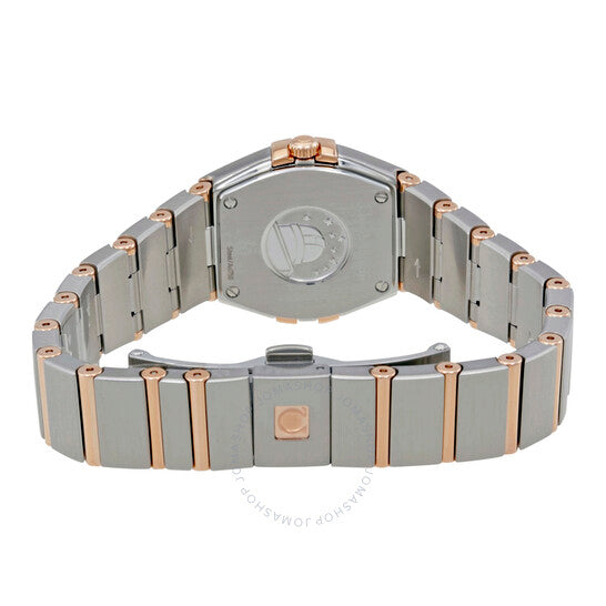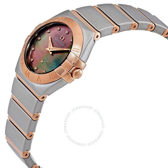 علبة من الفولاذ المقاوم للصدأ مع سوار من الفولاذ المقاوم للصدأ بقضبان من الذهب الوردي عيار 18 قيراطًا. إطار ثابت من الذهب الوردي عيار 18 قيراطًا. ميناء من عرق اللؤلؤ التاهيتي مع عقارب مضيئة من الذهب الوردي وعلامات ساعات من الألماس. نوع الميناء: تناظري. عقارب مضيئة. حركة كوارتز أوميغا عيار 1376 مع احتياطي طاقة يصل إلى 48 شهرًا. زجاج من الياقوت المقاوم للخدش. تاج قابل للسحب/الدفع. غطاء خلفي صلب. حجم العلبة: 24 مم. سمكها: 7.5 مم. شكلها دائري. عرض السوار: 15 مم. مشبك قابل للطي بزر ضغط. مقاومة للماء حتى عمق 100 متر / 330 قدمًا. الوظائف: الساعات، الدقائق. تصميم ساعة فاخرة. علامة الساعة: صناعة سويسرية. ساعة أوميغا كونستليشن نسائية بمينا من عرق اللؤلؤ 123.20.24.60.57.005.