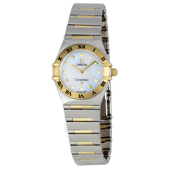 الجنس/المقاس: صغير. قطر العلبة: ٢٢.٥ مم. عمق العلبة: ٨ مم. نوع المشبك: مشبك مخفي. علبة من الفولاذ المقاوم للصدأ والذهب عيار ١٨ قيراطًا وسوار بقضيب وسطي. ميناء من عرق اللؤلؤ. كريستال ياقوت. حركة كوارتز سويسرية. مقاومة للماء. مجموعة أوميغا سيندي كروفورد بتصميمها الكلاسيكي لعلبتها الدائرية المصنوعة من الفولاذ المقاوم للصدأ والذهب عيار ١٨ قيراطًا وسوار بقضيب وسطي. تتميز الساعة ١٣٦١.٧١ بميناء من عرق اللؤلؤ مع علامات ذهبية، مما يجعلها مثالية لأي مناسبة. تُضفي الأرقام الرومانية وأربعة مخالب مصقولة من الذهب عيار ١٨ قيراطًا لمسةً مميزة على الإطار لإكمال التصميم، بينما تُضفي خاصية مقاومة الماء مزيدًا من المتانة. ساعة أوميغا كونستليشن ماي تشويس النسائية الصغيرة ١٣٦١.٧١