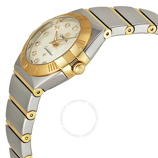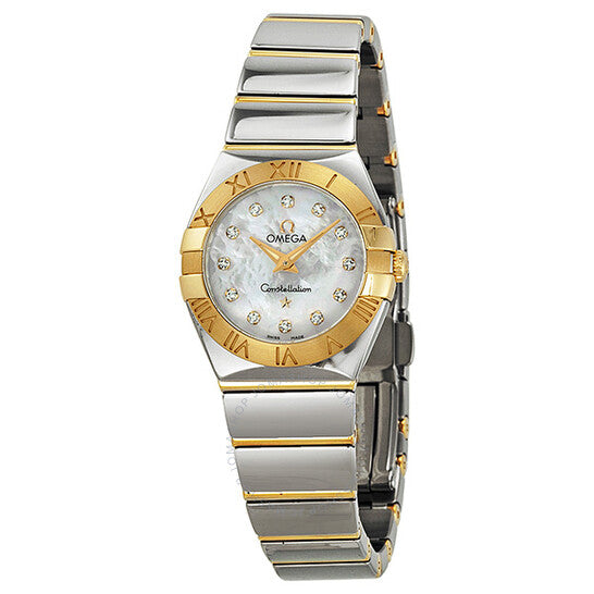 علبة من الفولاذ المقاوم للصدأ والذهب الأصفر مع سوار من الفولاذ المقاوم للصدأ والذهب الأصفر. إطار ثابت محفور عليه أرقام رومانية. ميناء أبيض من عرق اللؤلؤ مع عقارب ذهبية اللون وعلامات ساعات مرصعة بالألماس. نوع الميناء: تناظري. عقارب مضيئة. حركة كوارتز. زجاج ياقوت مقاوم للخدش. غطاء خلفي صلب. قطر العلبة: ٢٤ مم. سُمكها: ٧.٥ مم. عرض السوار: ١٥ مم. قابلة للطي بمشبك أمان. مقاومة للماء حتى عمق ١٠٠ متر / ٣٣٠ قدمًا. وظائفها: الساعات، الدقائق. تصميم ساعة فاخرة. علامة الساعة: صناعة سويسرية. ساعة أوميغا كونستليشن نسائية كوارتز مصقولة من عرق اللؤلؤ الأبيض ١٢٣٢٠٢٤٦٠٥٥٠٠٤.