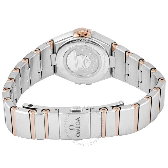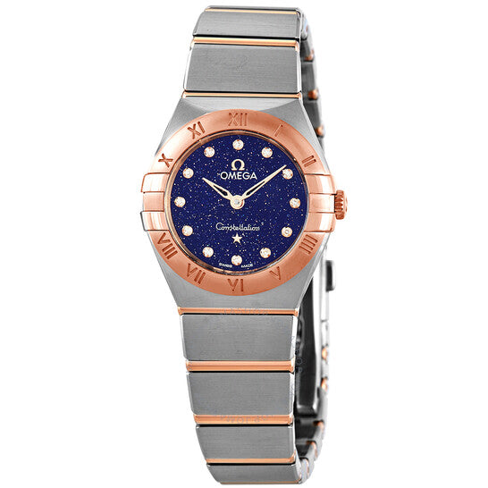 علبة من الفولاذ المقاوم للصدأ مع سوار من الفولاذ المقاوم للصدأ بقضبان من ذهب سيدنا عيار 18 قيراطًا. إطار ثابت من ذهب سيدنا عيار 18 قيراطًا. ميناء أزرق (أفينتورين) بعقارب هيكلية بلون الذهب الوردي وعلامات ساعات من الألماس. نوع الميناء: تناظري. حركة كوارتز أوميغا عيار 4061. زجاج من الياقوت المقاوم للخدش. غطاء خلفي صلب. شكل دائري. حجم العلبة: 25 مم. عرض السوار: 15.9 مم. مشبك قابل للطي بزر ضغط. مقاومة للماء حتى عمق 30 مترًا / 100 قدم. الوظائف: الساعات، الدقائق. طراز ساعة رسمية. علامة الساعة: صناعة سويسرية. ساعة أوميغا كونستليشن كوارتز نسائية مرصعة بالألماس بمينا أزرق 131.20.25.60.53.002.