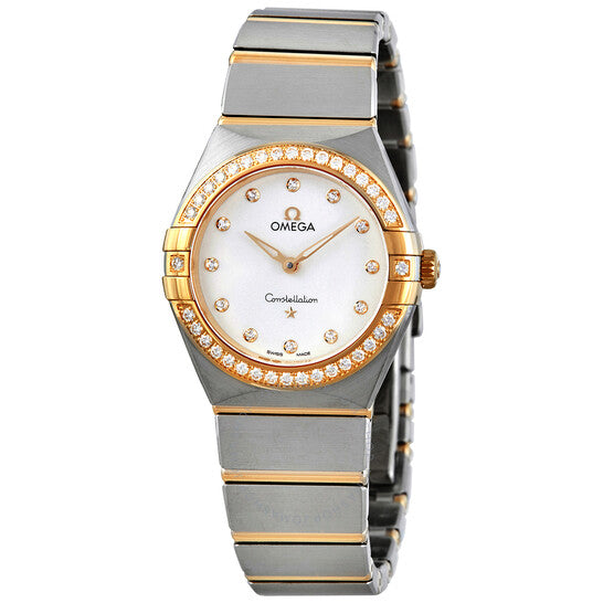 علبة من الفولاذ المقاوم للصدأ فضية اللون، مع سوار من الفولاذ المقاوم للصدأ ثنائي اللون (فضي وذهبي) بقضبان من الذهب الأصفر عيار 18 قيراطًا. إطار ثابت من الذهب الأصفر عيار 18 قيراطًا مرصع بالألماس. ميناء فضي مع عقارب هيكلية ذهبية اللون وعلامات ساعات من الألماس. نوع الميناء: تناظري. حركة كوارتز أوميغا كاليبر 4061. زجاج ياقوت مقاوم للخدش. تاج قابل للسحب/الدفع. غطاء خلفي صلب. شكل دائري، مقاس العلبة: 28 مم. عرض السوار: 17.5 مم. مشبك قابل للطي بزر ضغط. مقاومة للماء حتى عمق 30 مترًا / 100 قدم. الوظائف: الساعات، الدقائق. سلسلة كونستليشن. طراز ساعة رسمية. علامة الساعة: صناعة سويسرية. ساعة أوميغا كونستليشن كوارتز نسائية بمينا فضي مرصعة بالألماس، رقمها 131.25.28.60.52.002.