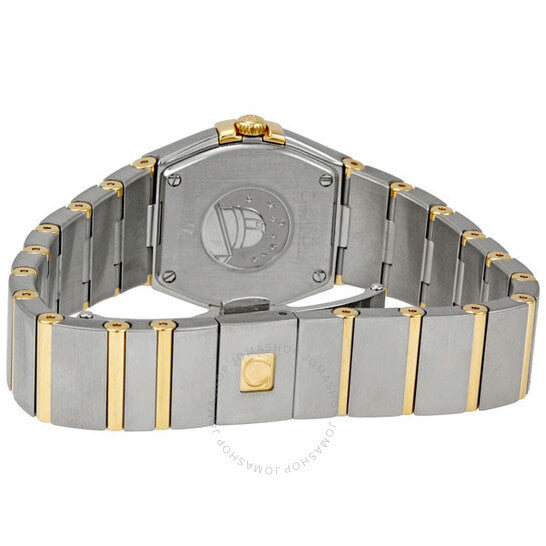 علبة من الفولاذ المقاوم للصدأ والذهب عيار ١٨ قيراطًا، مع سوار من الفولاذ المقاوم للصدأ بقضبان من الذهب عيار ١٨ قيراطًا. إطار ثابت من الذهب عيار ١٨ قيراطًا مرصع بالألماس. ميناء فضي اللون بعقارب ذهبية اللون و١٢ علامة ساعة مرصعة بالألماس. حركة كوارتز. زجاج من الياقوت المقاوم للخدش. قطر العلبة: ٢٤ مم. مشبك قابل للطي بزر ضغط. مقاومة للماء حتى عمق ١٠٠ متر/٣٣٠ قدمًا. الوظائف: الساعات، الدقائق. ساعة أوميغا كونستليشن النسائية ثنائية اللون ١٢٣٢٥٢٤٦٠٥٢٠٠٢.