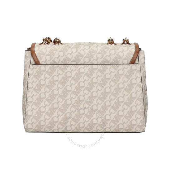 حقيبة كتف نسائية من مايكل كورس. رمز المنتج: 30H3G7PS6B-099. اللون: بيج. حقيبة كروس بودي قابلة للتحويل بسلسلة من مايكل كورس. تتميز هذه الحقيبة بشعار إمباير، بتصميم متعدد الاستخدامات، يمكن حملها كحقيبة كروس بودي أو كتف. تتميز بشعار إم كيه لامع على الجهة الأمامية، وغطاء بقفل ضغط، وأجزاء معدنية ذهبية اللون. تحتوي الحقيبة الخارجية على جيب خلفي منزلق، بينما يوفر الجزء الداخلي سحابًا وقفلًا. 80% بولي كلوريد الفينيل، 16% بوليستر، 4% قطن. صُنعت في فيتنام.