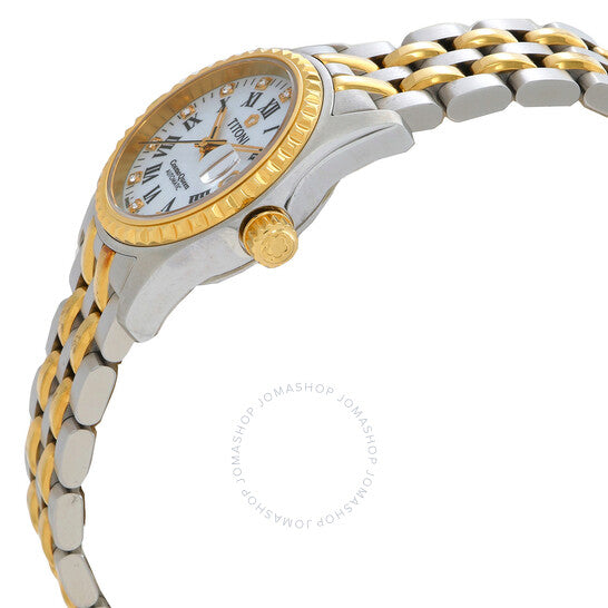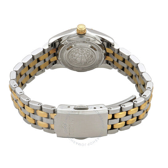 علبة من الفولاذ المقاوم للصدأ فضية اللون، مع سوار من الفولاذ المقاوم للصدأ ثنائي اللون (فضي وذهبي أصفر مطلي بتقنية الترسيب الفيزيائي للبخار). إطار ثابت من الفولاذ المقاوم للصدأ مطلي بتقنية الترسيب الفيزيائي للبخار. ميناء أبيض بعقارب ذهبية اللون، وعلامات ساعات بأرقام رومانية. علامات دقائق حول الحافة الخارجية. نوع الميناء: تناظري. عرض التاريخ عند موضع الساعة 3. حركة أوتوماتيكية. زجاج ياقوت مقاوم للخدش. تاج قابل للسحب/الدفع. غطاء خلفي صلب. شكل دائري، مقاس العلبة: 27 مم. مشبك فراشة. مقاومة للماء حتى عمق 100 متر / 330 قدمًا. الوظائف: التاريخ، الساعة، الدقيقة، الثانية. سلسلة كوزمو. اسم الساعة: صناعة سويسرية. ساعة تيتوني كوزمو أوتوماتيكية نسائية بمينا أبيض، 729 SY-019.
