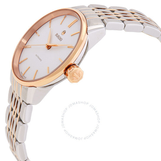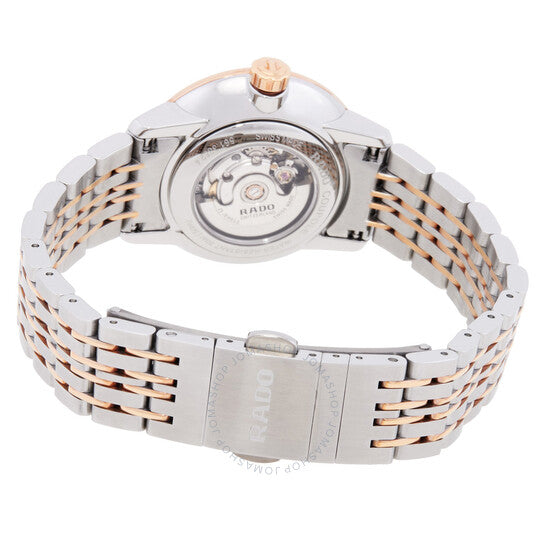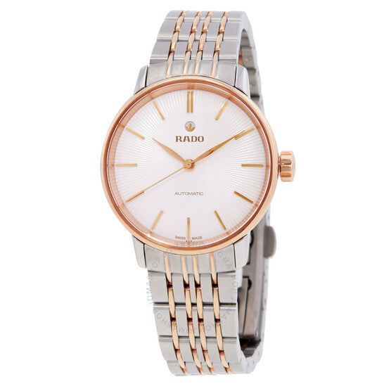 علبة فضية اللون من الفولاذ المقاوم للصدأ، مع سوار ثنائي اللون (فضي وذهبي وردي) من الفولاذ المقاوم للصدأ والتيتانيوم. إطار ثابت من الفولاذ المقاوم للصدأ بلون ذهبي وردي. ميناء أبيض مع عقارب وعلامات ساعات ذهبية وردية. نوع الميناء: تناظري. حركة أوتوماتيكية باحتياطي طاقة لمدة 44 ساعة. زجاج من الياقوت المقاوم للخدش. تاج قابل للسحب/الدفع. غطاء خلفي شفاف. شكل العلبة دائري، مقاسها: 31.8 مم، سمكها: 9.7 مم. مشبك قابل للطي بزر ضغط. مقاومة للماء حتى عمق 50 مترًا / 165 قدمًا. الوظائف: الساعات، الدقائق، الثواني. سلسلة كوبول. طراز ساعة رسمية. علامة الساعة: صناعة سويسرية. رقم المنتج: 01.561.3862.4.402. ساعة رادو كوبول أوتوماتيكية نسائية بمينا بيضاء، R22862027.