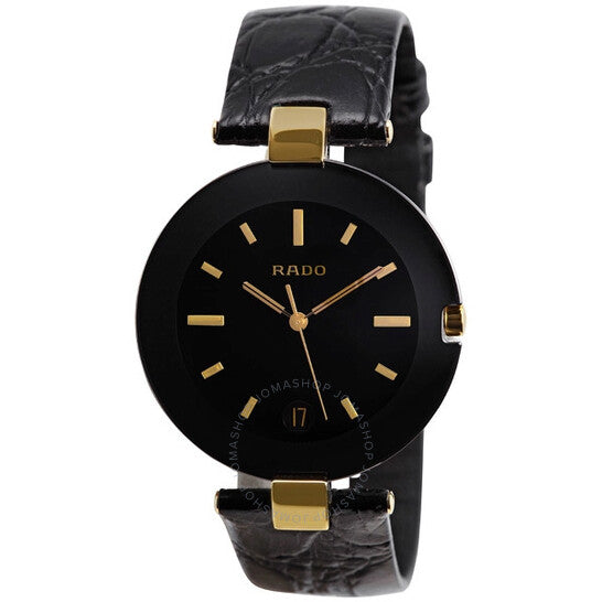 علبة سيراميك سوداء مع حزام جلدي أسود. إطار ثابت من السيراميك الأسود. ميناء أسود بعقارب ذهبية اللون وعلامات ساعات. يظهر اسم رادو أسفل موضع الساعة ١٢. نافذة عرض التاريخ عند موضع الساعة ٣. حركة كوارتز تعمل بالبطارية. زجاج ياقوتي مقاوم للخدش. غطاء خلفي صلب. قطر العلبة: ٣٥ مم. مشبك تانغ. مقاومة للماء حتى عمق ٣٠ مترًا / ١٠٠ قدم. الوظائف: الساعات، الدقائق، الثواني.