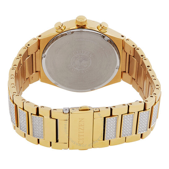 علبة من الفولاذ المقاوم للصدأ بلون ذهبي، وسوار من الفولاذ المقاوم للصدأ بلون ذهبي مرصع بلمسات من الكريستال. إطار ذهبي ثابت مرصع بالكريستال. ميناء أزرق بعقارب ذهبية اللون وعلامات ساعات من الكريستال. علامات دقائق حول الحافة الخارجية. نوع الميناء: تناظري. عرض التاريخ عند موضع الساعة 3. كرونوغراف - ثلاثة أقراص فرعية تعرض: 60 ثانية، 60 دقيقة، و24 ساعة. حركة Citizen Caliber Eco-Drive B612 eco-drive. كريستال معدني مقاوم للخدش. تاج قابل للسحب/الدفع. غطاء خلفي صلب. شكل دائري، مقاس العلبة: 42 مم. عرض السوار: 25.5 مم. مشبك قابل للطي مع مفتاح أمان. مقاومة للماء حتى عمق 50 مترًا / 165 قدمًا. الوظائف: كرونوغراف، تاريخ، ساعة، دقيقة، ثانية، تعمل بالطاقة الشمسية. سلسلة كريستال. طراز ساعة رياضية. ملصق الساعة: Japan Movt. ساعة Citizen Crystal Chronograph Blue Dial للرجال CA0752-58L.