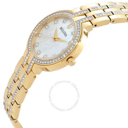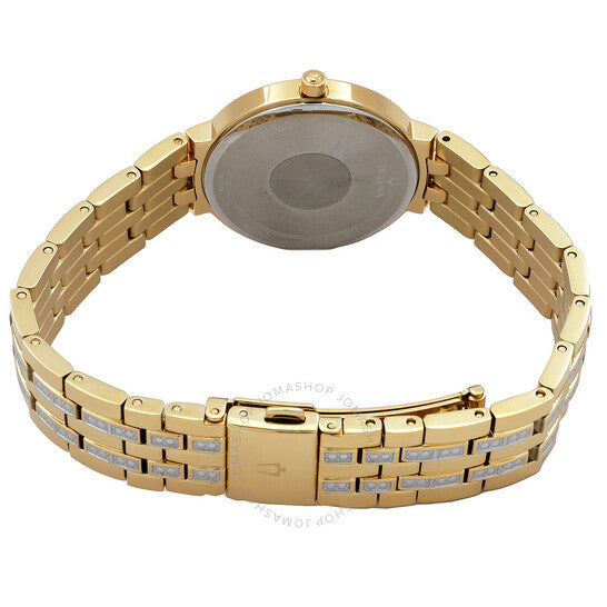 علبة وسوار من الفولاذ المقاوم للصدأ ذهبي اللون. إطار ذهبي ثابت مرصع بالألماس. ميناء فضي بعقارب ذهبية اللون وعلامات ساعات من الألماس. نوع الميناء: تناظري. حركة كوارتز بولوفا كاليبر GL32. زجاج ياقوت مقاوم للخدش. غطاء خلفي صلب. شكل العلبة دائري، مقاسها: 30 مم. عرض السوار: 14 مم. طي قصير مع مشبك بزر ضغط. مقاومة للماء حتى عمق 30 مترًا / 100 قدم. الوظائف: الساعات، الدقائق، الثواني. سلسلة كريستال. ساعة رسمية. ساعة بولوفا كريستال كوارتز نسائية بمينا فضي مرصعة بالألماس، 98X138.