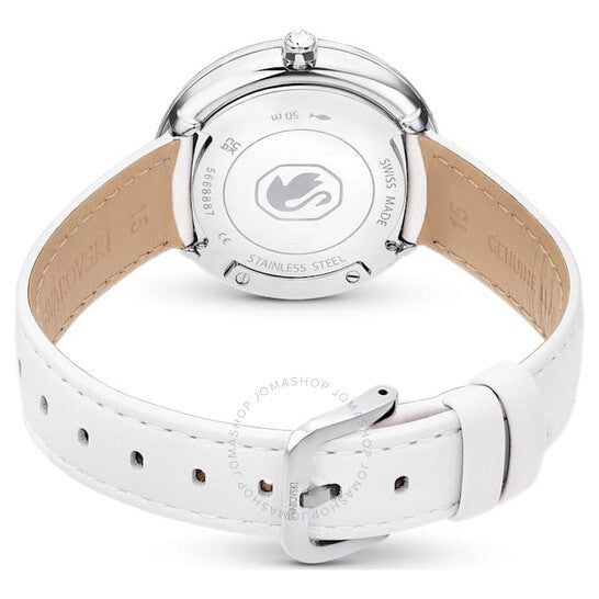 علبة من الفولاذ المقاوم للصدأ فضية اللون مع سوار جلدي أبيض. إطار ثابت. ميناء كريستالي بعقارب فضية اللون. شعار سواروفسكي على شكل بجعة عند موضع الساعة ١٢. نوع الميناء: تناظري. حركة كوارتز. كريستال ياقوت مقاوم للخدش. تاج قابل للسحب/الدفع. غطاء خلفي صلب. شكل دائري، مقاس العلبة: ٣٣ مم. مشبك بإبزيم. مقاومة للماء حتى عمق ٥٠ مترًا / ١٦٥ قدمًا. الوظائف: الساعات، الدقائق. سلسلة كريستالين لاستر. تصميم كاجوال. علامة الساعة: صناعة سويسرية. ساعة سواروفسكي كريستالين لاستر، سوار جلدي من الفولاذ المقاوم للصدأ، رقم ٥٦٦٨٨٨٧.