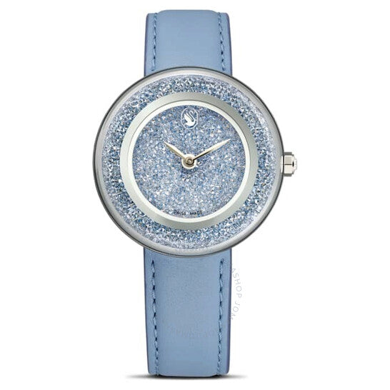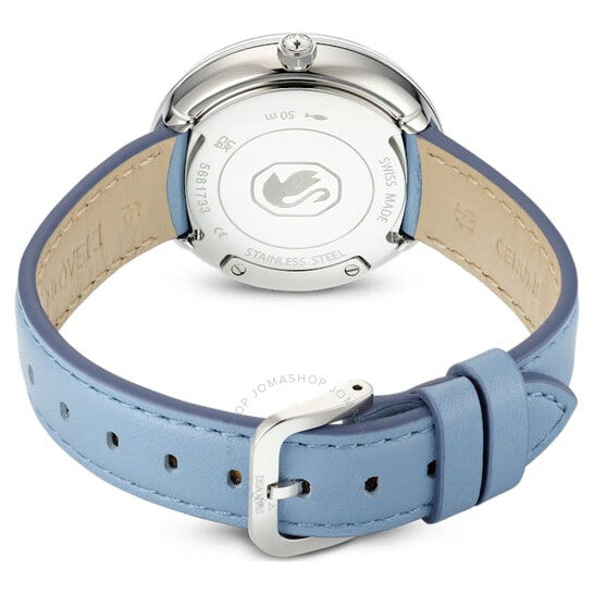 علبة من الفولاذ المقاوم للصدأ فضية اللون مع سوار جلدي أزرق. إطار ثابت. ميناء من الكريستال الأزرق بعقارب فضية اللون. شعار سواروفسكي على شكل بجعة عند موضع الساعة ١٢. نوع الميناء: تناظري. حركة كوارتز. كريستال ياقوت مقاوم للخدش. تاج قابل للسحب/الدفع. غطاء خلفي صلب. شكل دائري، مقاس العلبة: ٣٣ مم. مشبك بإبزيم. مقاومة للماء حتى عمق ٥٠ مترًا / ١٦٥ قدمًا. الوظائف: الساعات، الدقائق. سلسلة كريستالين لاستر. تصميم كاجوال. علامة الساعة: صناعة سويسرية. ساعة سواروفسكي كريستالين لاستر كوارتز نسائية ٥٦٨١٧٣٣.