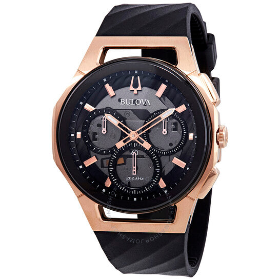 علبة من الفولاذ المقاوم للصدأ بلون الذهب الوردي مع سوار مطاطي أسود. إطار ثابت من الفولاذ المقاوم للصدأ مطلي بالأيونات السوداء. ميناء أسود (شفاف في المنتصف) مع عقارب مضيئة بلون الذهب الوردي وعلامات ساعات. علامات دقائق حول الحافة الخارجية. نوع الميناء: تناظري. عقارب وعلامات مضيئة. كرونوغراف - ثلاثة أقراص فرعية تعرض: ٦٠ ثانية، ٦٠ دقيقة، و١/١٠ من الثانية. حركة كوارتز. زجاج ياقوت مقاوم للخدش. تاج قابل للسحب/الدفع. غطاء خلفي شفاف. شكل دائري، مقاس العلبة: ٤٤ مم، سمكها: ١٠.١ مم. عرض السوار: ٢٠ مم. مشبك قابل للطي بزر ضغط. مقاومة للماء حتى عمق ٣٠ مترًا / ١٠٠ قدم. الوظائف: كرونوغراف، ساعات، دقائق، ثوانٍ. سلسلة Curv. طراز ساعة رياضية. ساعة بولوفا Curv كرونوغراف للرجال بمينا سوداء، ٩٨A١٨٥.