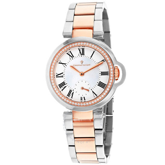 علبة من الفولاذ المقاوم للصدأ فضية اللون مع سوار من الفولاذ المقاوم للصدأ ثنائي اللون (فضي وذهبي وردي). إطار ثابت من الفولاذ المقاوم للصدأ فضي اللون. ميناء من عرق اللؤلؤ مع عقارب ذهبية وردية وعلامات ساعات بأرقام رومانية. مقياس دقائق حول الحافة الداخلية. نوع الميناء: تناظري. ميناء فرعي واحد يعرض الثواني الصغيرة. حركة كوارتز. زجاج معدني مقاوم للخدش. شكل العلبة دائري، مقاسها: 35 مم، سمكها: 9 مم. عرض السوار: 19 مم. مشبك قابل للطي بزر ضغط. مقاومة للماء حتى عمق 30 مترًا / 100 قدم. الوظائف: الساعات، الدقائق، الثواني الصغيرة. سلسلة سيبيل. ساعة أنيقة. ساعة كريستيان فان سانت سيبيل النسائية CV0234 بمينا عرق اللؤلؤ.
