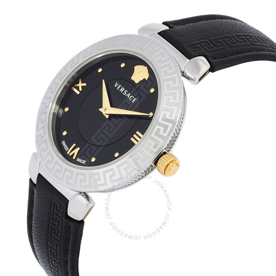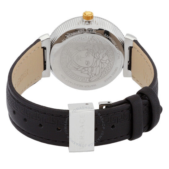 علبة من الفولاذ المقاوم للصدأ فضية اللون مع سوار جلدي أسود. إطار ثابت من الفولاذ المقاوم للصدأ فضي اللون. ميناء أسود بعقارب ذهبية اللون ومؤشرات ساعات بأرقام رومانية. نوع الميناء: تناظري. حركة كوارتز. زجاج ياقوتي مقاوم للخدش. تاج قابل للسحب/الدفع. غطاء خلفي صلب. شكل دائري، مقاس العلبة: 35 مم، سمكها: 8 مم. عرض السوار: 19 مم. مشبك بإبزيم. مقاومة للماء حتى عمق 30 مترًا / 100 قدم. الوظائف: الساعات، الدقائق. سلسلة دافنيس. تصميم كاجوال. علامة الساعة: صناعة سويسرية. ساعة فيرساتشي دافنيس كوارتز نسائية بمينا سوداء V16020017.
