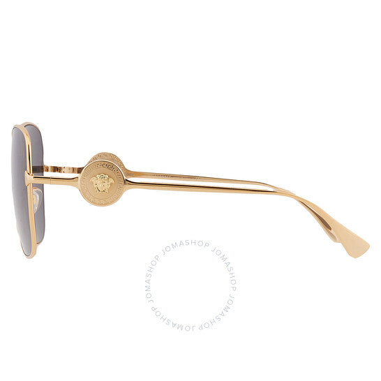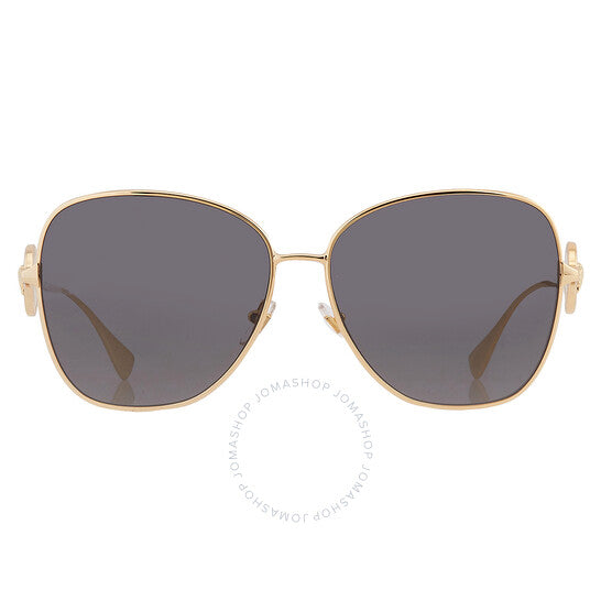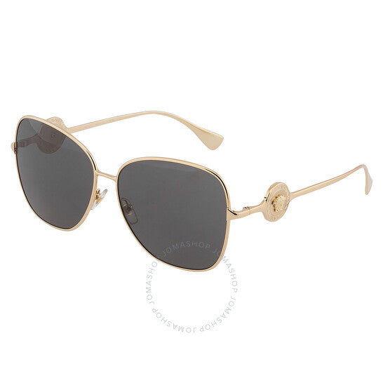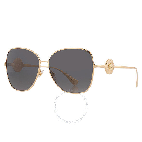 نظارات شمسية من فيرساتشي. رقم السلسلة: VE2256. رمز اللون: 100287. الشكل: فراشة. عرض العدسة: 60 مم. جسر العدسة: 14 مم. طول الذراع: 140 مم. حماية 100% من الأشعة فوق البنفسجية. مادة الإطار: معدن. لون الإطار: ذهبي. نوع العدسات: رمادي داكن. نمط الحافة: حافة كاملة. رمز UPC/EAN: 8056597838481. نظارات شمسية نسائية من فيرساتشي بتصميم فراشة رمادية داكنة VE2256 100287 60.