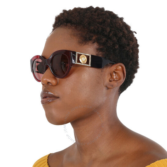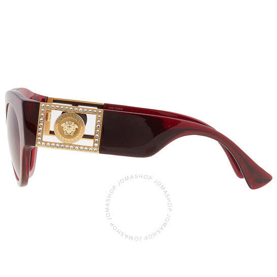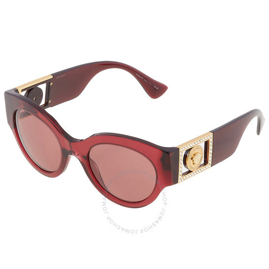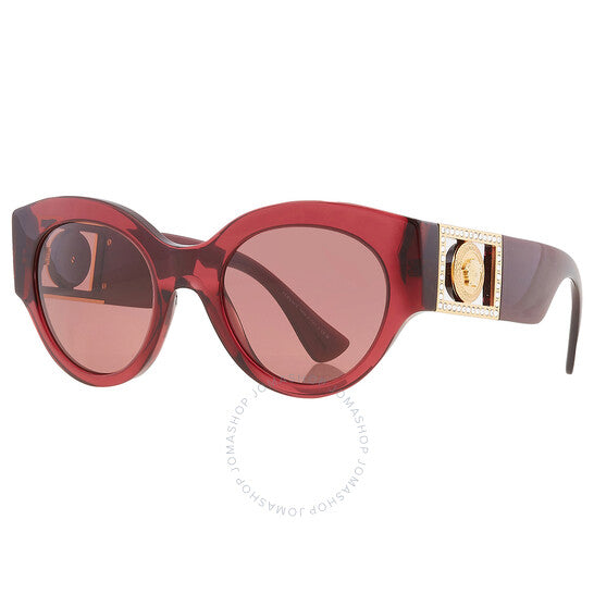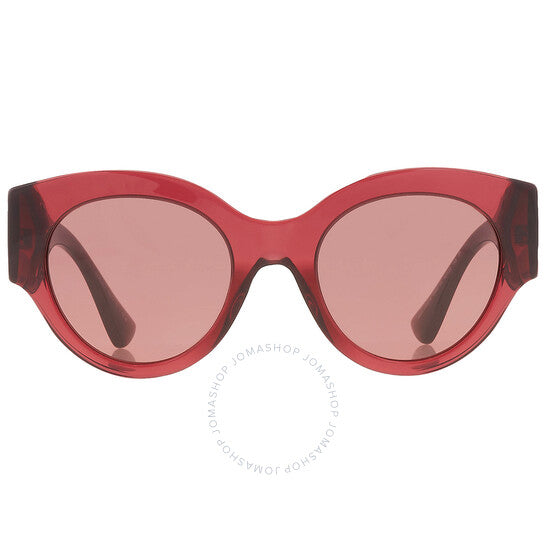 نظارات شمسية من فيرساتشي. رقم السلسلة: VE4438B. رمز اللون: 538569. الشكل: دائري. عرض العدسة: 52 مم. جسر العدسة: 22 مم. طول الذراع: 145 مم. حماية 100% من الأشعة فوق البنفسجية. غير مستقطبة. مادة الإطار: معدن؛ بلاستيك. لون الإطار: أحمر باريد شفاف. نوع العدسات: بنفسجي داكن. نمط الحافة: حافة كاملة. رمز UPC/EAN: 8056597768610. نظارات شمسية نسائية دائرية من فيرساتشي بنفسجية داكنة VE4438B 538569 52.