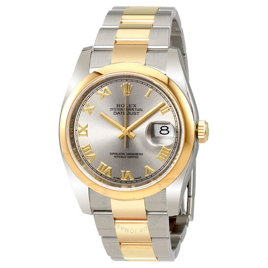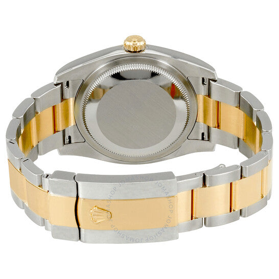 علبة من الفولاذ المقاوم للصدأ مع سوار رولكس أويستر من الفولاذ المقاوم للصدأ، مع وصلات مركزية من الذهب الأصفر عيار 18 قيراطًا. إطار ثابت من الذهب الأصفر عيار 18 قيراطًا. ميناء من الروديوم بعقارب ذهبية اللون وعلامات ساعات بأرقام رومانية. علامات دقائق حول الحافة الخارجية. نوع الميناء: تناظري. عرض التاريخ عند موضع الساعة 3. حركة رولكس أوتوماتيكية من عيار 3135 مع احتياطي طاقة لمدة 48 ساعة. كريستال ياقوت مقاوم للخدش. تاج لولبي. غطاء خلفي صلب. حجم العلبة: 36 مم. شكل دائري. مشبك أويسترلوك. مقاومة للماء حتى عمق 100 متر / 330 قدمًا. الوظائف: التاريخ، الساعة، الدقائق، الثواني. طراز ساعة فاخرة. علامة الساعة: صناعة سويسرية. ساعة رولكس ديت جست رجالية أوتوماتيكية، مينا روديوم، فولاذ وذهب أصفر عيار 18 قيراطًا، رقم 116203.