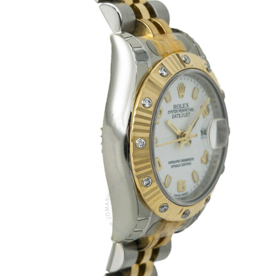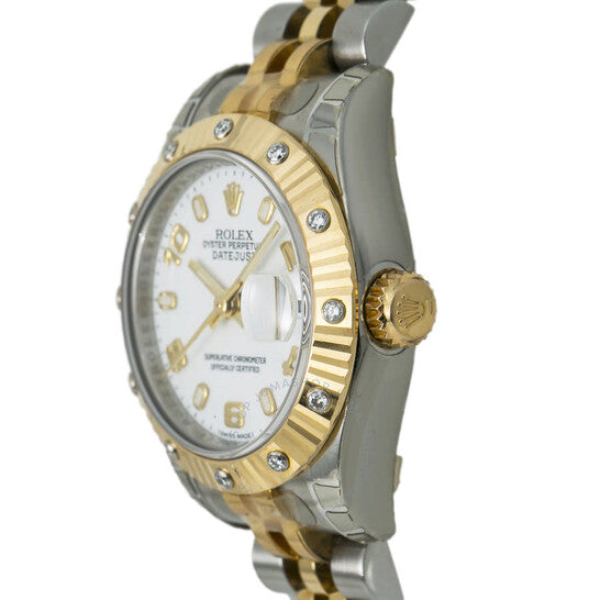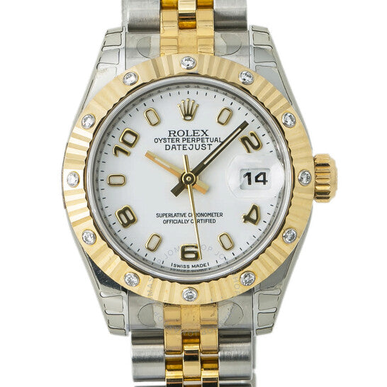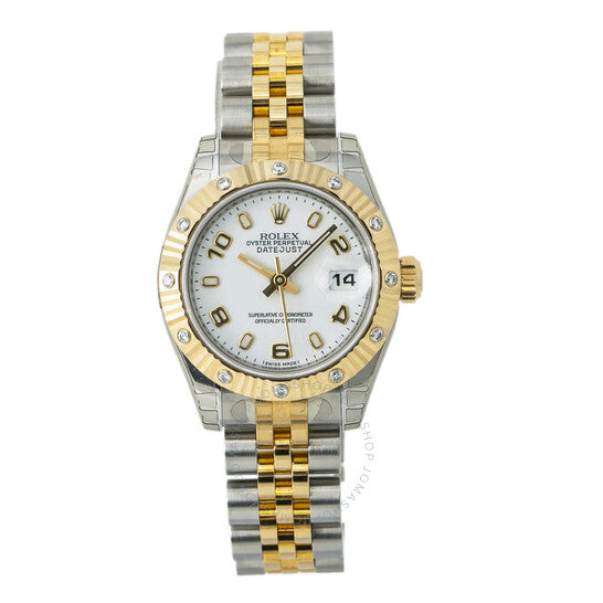 علبة فضية اللون من الفولاذ المقاوم للصدأ، مع سوار فضي اللون من الذهب الأصفر عيار ١٨ قيراطًا والفولاذ المقاوم للصدأ. إطار ثابت من الذهب الأصفر عيار ١٨ قيراطًا مرصع بالألماس. ميناء أبيض بعقارب ذهبية اللون، وأرقام عربية وعلامات ساعات. علامات دقائق حول الحافة الخارجية. نوع الميناء: تناظري. عقارب وعلامات مضيئة. عرض التاريخ عند موضع الساعة الثالثة. حركة رولكس كاليبر ٢٢٣٥ أوتوماتيكية، تحتوي على ٣١ جوهرة، تنبض بتردد ٢٨٨٠٠ ذبذبة في الساعة، ولديها احتياطي طاقة لمدة ٤٨ ساعة تقريبًا. زجاج من الياقوت المقاوم للخدش. تاج لولبي. غطاء خلفي صلب. شكل دائري، حجم العلبة: ٢٦ مم، سمكها: ١١ مم. عرض السوار: ١٣ مم، طول السوار: ٦ بوصات. مشبك قابل للطي. مقاومة للماء حتى عمق ١٠٠ متر / ٣٣٠ قدمًا. الوظائف: ساعة، دقيقة، ثانية، تاريخ، مقاومة للماء. طراز ساعة فاخرة. ملصق الساعة: صناعة سويسرية. ساعة رولكس ديت جست للسيدات بمينا أبيض 179313WAJ.