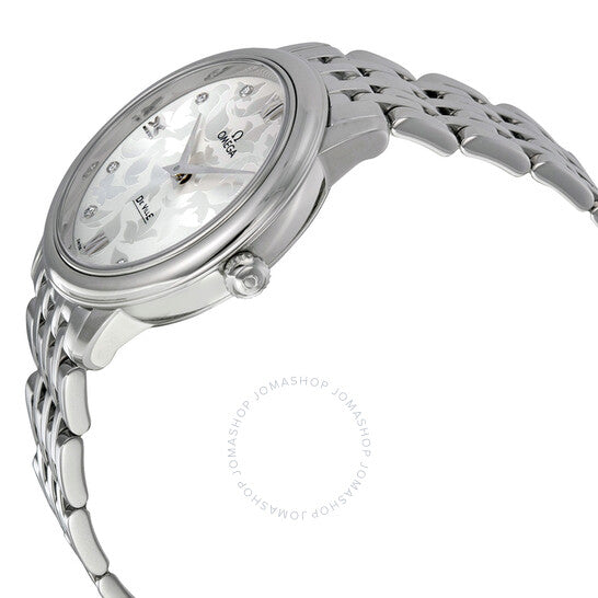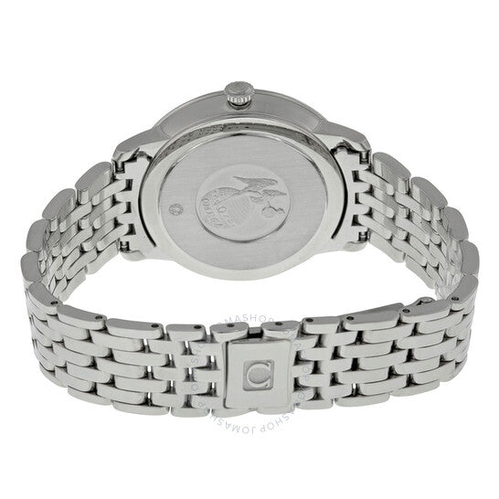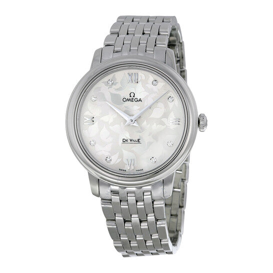 علبة من الفولاذ المقاوم للصدأ مع سوار من الفولاذ المقاوم للصدأ. إطار ثابت من الفولاذ المقاوم للصدأ. ميناء فضي بعقارب فضية اللون وعلامات ساعات من الألماس. أرقام رومانية تُشير إلى مواقع الساعات 3 و6 و9 و12. نوع الميناء: تناظري. حركة كوارتز. زجاج ياقوت مقاوم للخدش. تاج قابل للسحب/الدفع. غطاء خلفي صلب. قطر العلبة: 32.7 مم. شكلها دائري. عرض السوار: 21.6 مم. طول السوار: 8.5 بوصة. مشبك قابل للطي مع مفتاح أمان. مقاومة للماء حتى عمق 30 مترًا / 100 قدم. الوظائف: الساعات، الدقائق. تصميم ساعة فاخرة. علامة الساعة: صناعة سويسرية. ساعة أوميغا دي فيل بريستيج نسائية من الفولاذ المقاوم للصدأ بمينا فضي مرصع بالألماس، رقم 42410336052001.