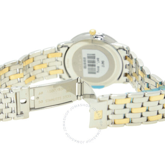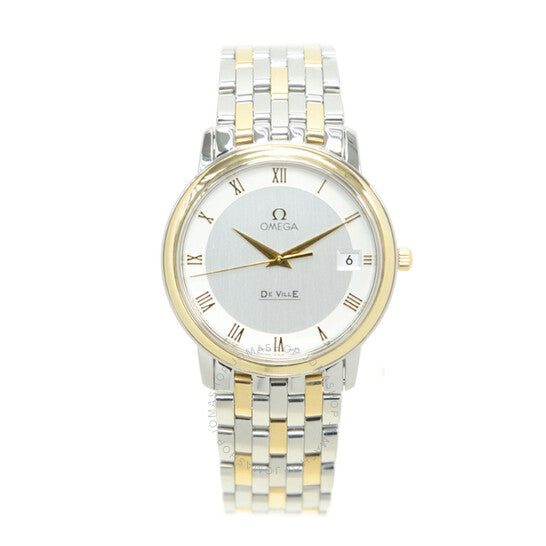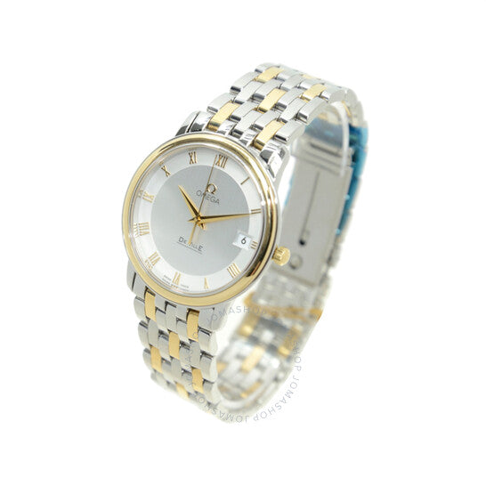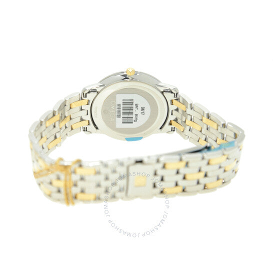 علبة فضية اللون من الفولاذ المقاوم للصدأ، مع سوار ثنائي اللون (فضي وذهبي أصفر) من الذهب الأصفر عيار 18 قيراطًا والفولاذ المقاوم للصدأ. إطار ثابت من الذهب الأصفر عيار 18 قيراطًا. ميناء فضي اللون مع عقارب ذهبية اللون وعلامات ساعات رومانية. نوع الميناء: تناظري. عرض التاريخ عند موضع الساعة 3. حركة كوارتز أوميغا كاليبر 1532. زجاج ياقوت مقاوم للخدش. غطاء خلفي صلب. شكل دائري، مقاس العلبة: 34.4 مم. مشبك قابل للطي مع مفتاح أمان. مقاومة للماء حتى عمق 30 مترًا / 100 قدم. الوظائف: التاريخ، الساعة، الدقيقة، الثانية، مؤشر عمر البطارية. معلومات إضافية: العلبة الأصلية، دليل الاستخدام (ملحقات كاملة). سلسلة دي فيل. تصميم ساعة فاخرة. علامة الساعة: صناعة سويسرية. ساعة أوميغا دي فيل كوارتز نسائية بمينا فضي، رقمها 4310.32.00.